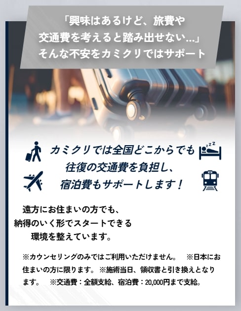 「安さ」の理由とは少しズレますが、カミノクリニックの人気を支えているのが、手厚い交通費・宿泊費サポートです。