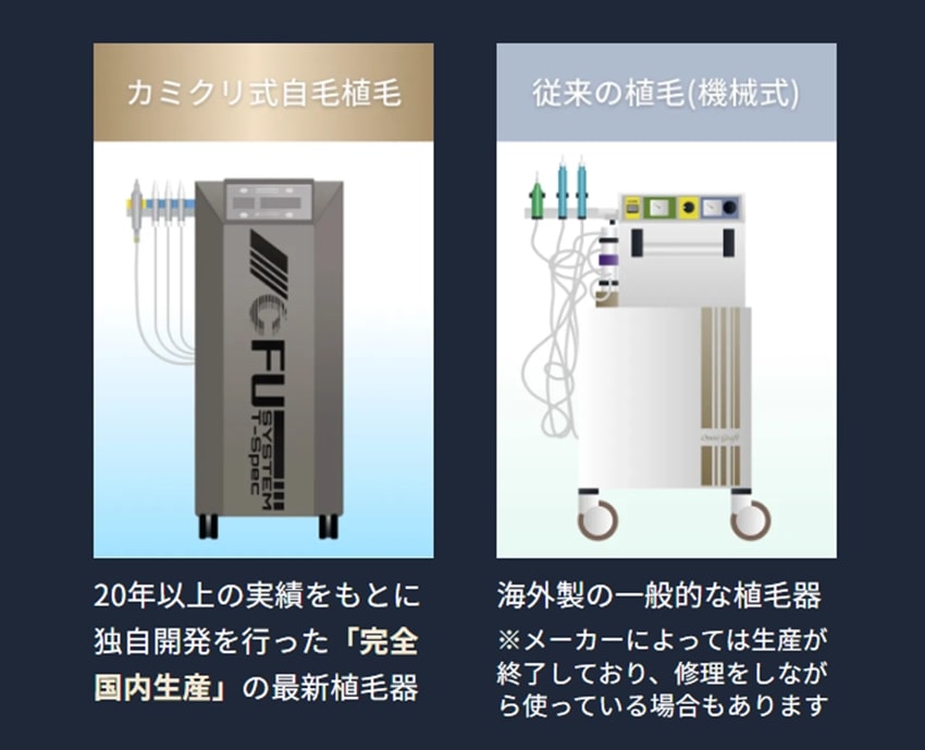 海外製の一般的な機械をそのまま日本人に使うと、太い毛根を採取する際に途中で切断してしまったり(株の切断)、傷つけてしまったりするリスクがありました。