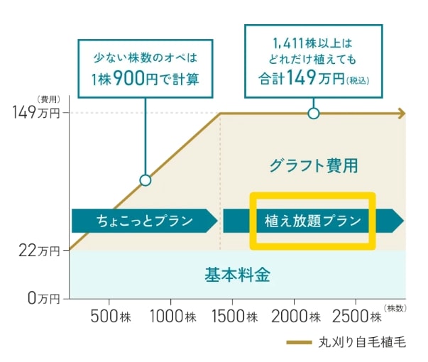 通常の自毛植毛は「1株○○円」という積み上げ方式ですが、東京植毛クリニックには植え放題プランがあります。